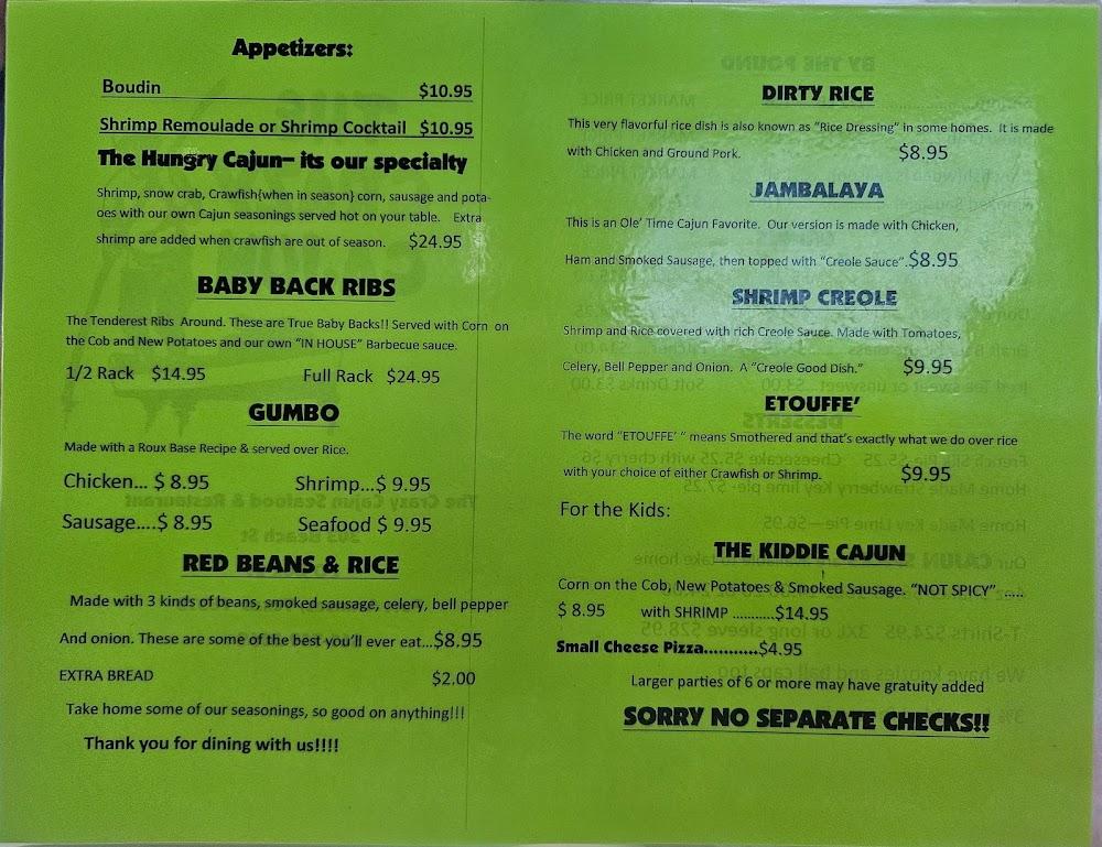 The menu at Crazy Cajun offers a delightful variety of Cajun and seafood dishes. A must-try is the shrimp gumbo, rich with spices and flavors that capture the essence of the region. The signature Hungry Cajun dish combines different seafood, including crab, shrimp, and sausage, providing a taste experience unlike any other.